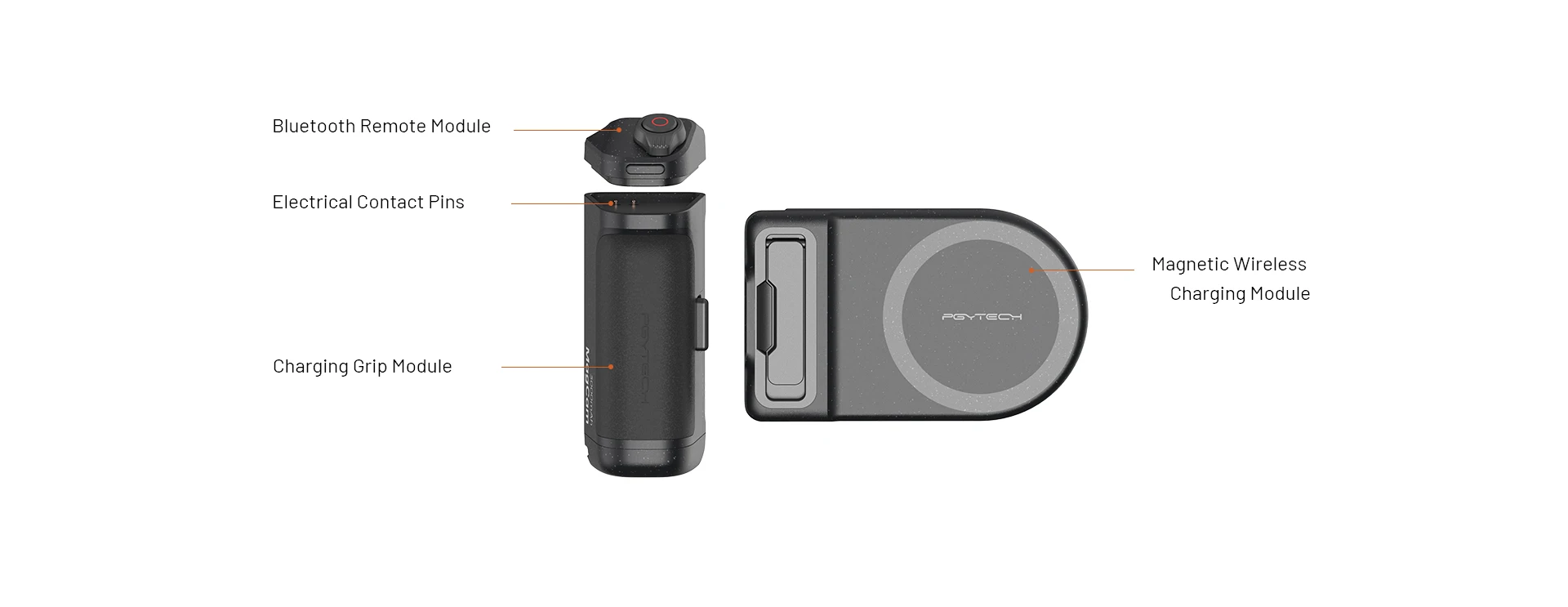 1. Modulares Design: Lässt sich in drei Teile zerlegen: magnetisches kabelloses Lademodul, Bluetooth-Fernbedienungsmodul und Ladegriffmodul für ultimative Vielseitigkeit.