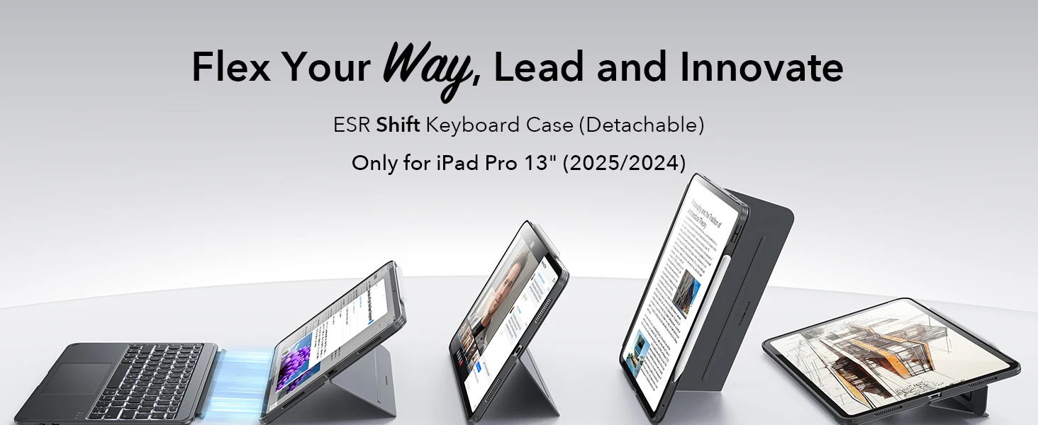 Unleash your iPad's full potential with the ESR Shift Magnetic Keyboard Case. Featuring a powerful magnetic connection, precision trackpad, and revolutionary detachable design, this versatile case adapts to any task. Instantly switch between typing, drawing, and media consumption with portrait and landscape modes for ultimate flexibility.