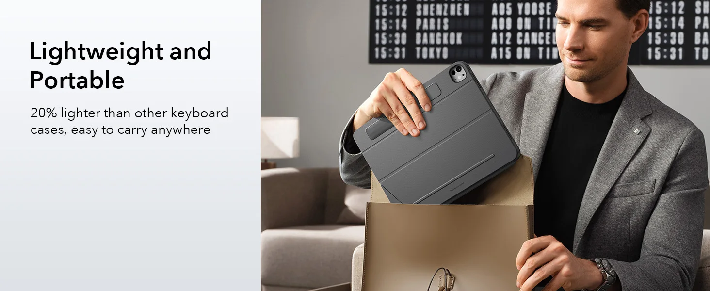 The ESR Shift Magnetic Keyboard Case revolutionizes how you use your iPad. The detachable design means you can remove the keyboard for hands-on drawing or browsing while keeping the protective back cover attached. Switch effortlessly between portrait mode for video calls and landscape mode for productivity. The full-size keyboard and precision trackpad deliver a laptop-like experience wherever you work.