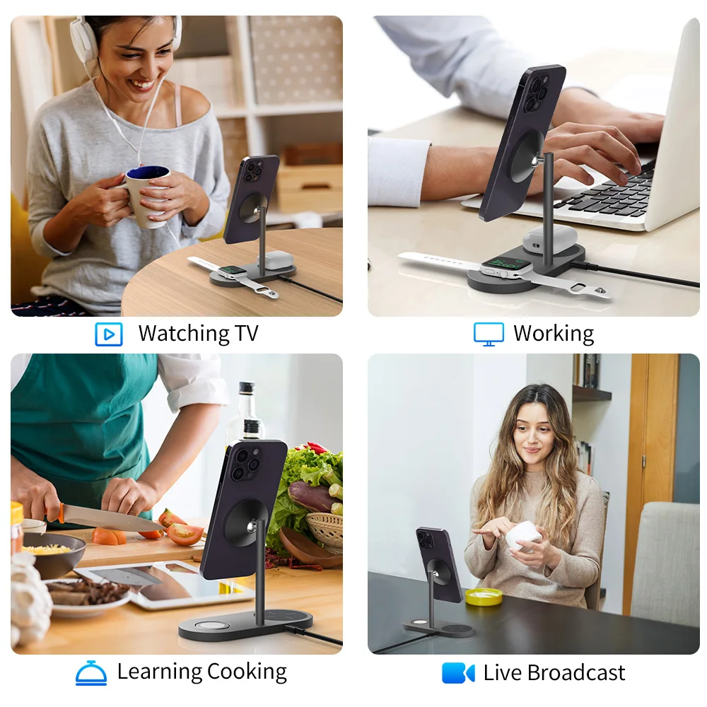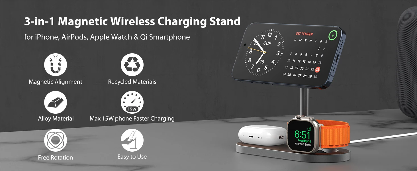 convenient and efficient way to charge your iPhone, Apple Watch, AirPods/AirPods Pro and Android Phones. all at once? Look no further than our Magnetic iPhone Stand and Wireless Charger! -
