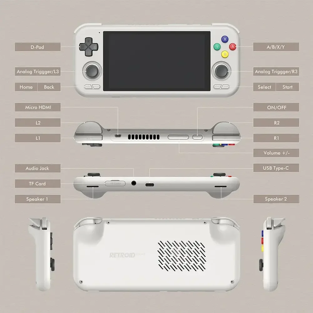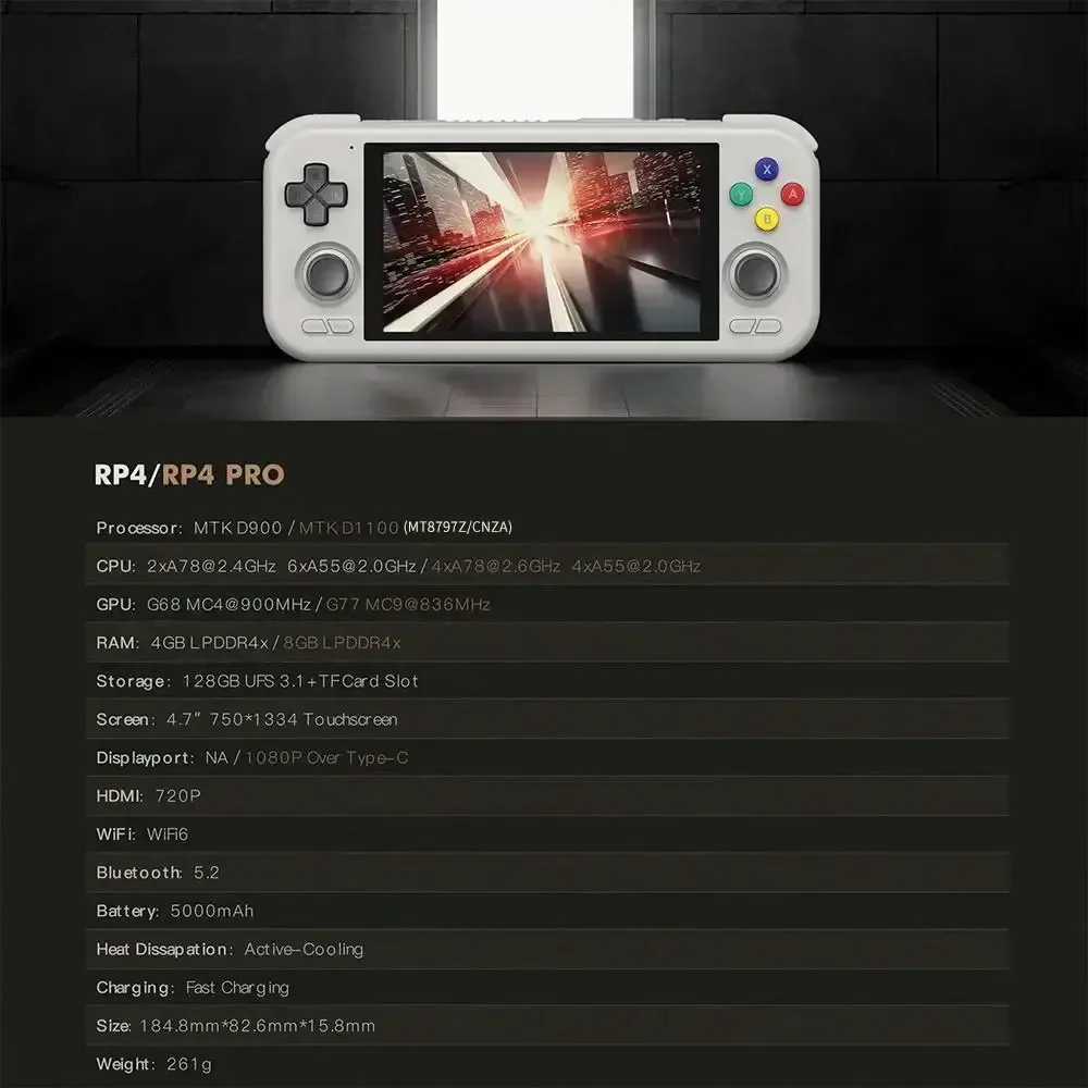 The Retroid Pocket 4 Pro is a high-performance Android handheld gaming console. It is built to emulate demanding systems up to PlayStation 2 (PS2), GameCube (GC), and even some Nintendo Switch (NS) titles, thanks to its powerful MediaTek Dimensity 1100 processor and 8GB of RAM. It runs on the customizable Android 13 operating system.