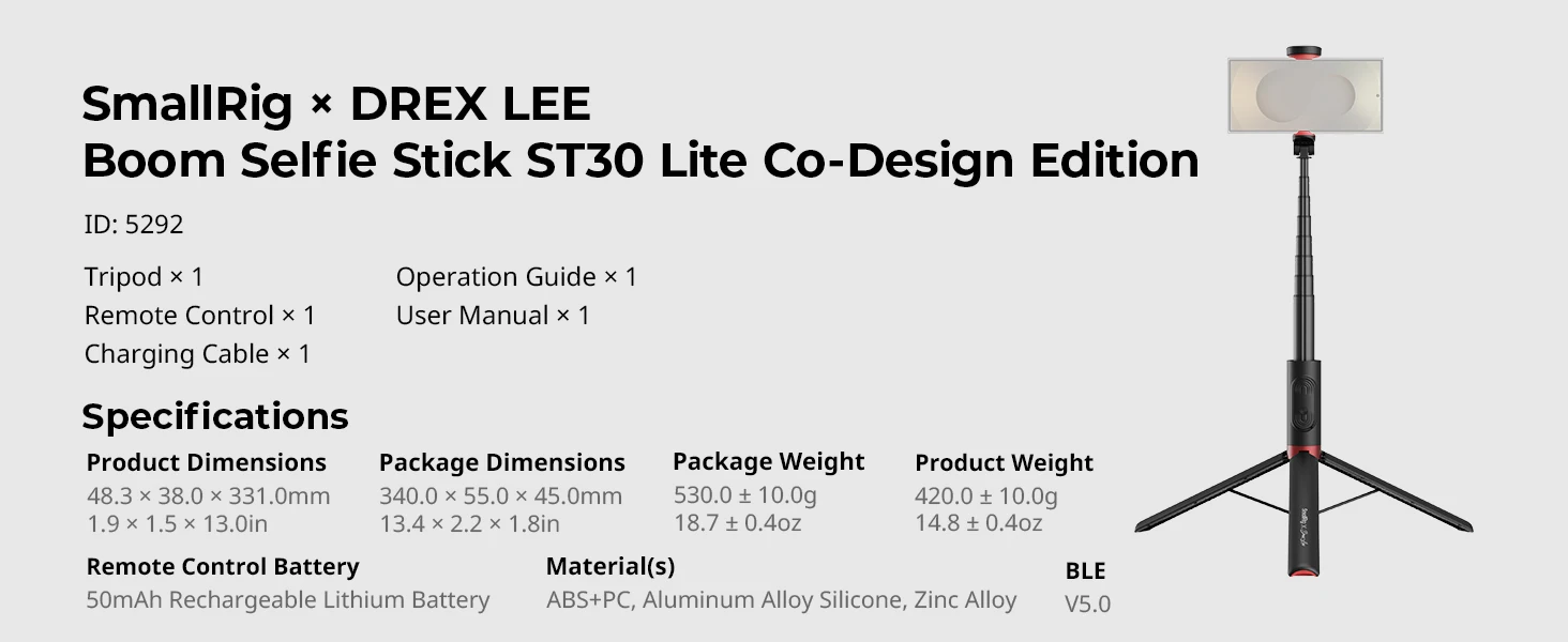 SmallRig x Drex Lee Boom ST30 One-Touch Deploy Selfie Stick Tripod